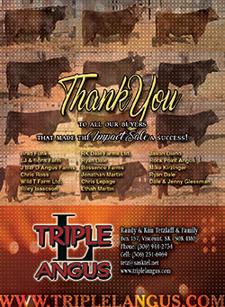Lot 20 - $5,400.00 - Triple L Free Ride 52D by 20/20 Free Ride 18B was purchased by Dale and Jenny Glessman, Bruno, Saskatchewan
